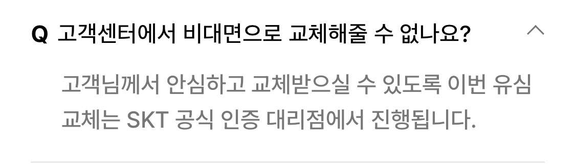 - SKT ์๋ฐํฐ ๊ณ ๊ฐ๋์ ์๋ฐํฐ ๊ณ ๊ฐ์ผํฐ๋ฅผ ํตํด ์ ์ฌ ๊ต์ฒด๋ฅผ ์งํํด ์ฃผ์๊ธฐ ๋ฐ๋๋๋ค.