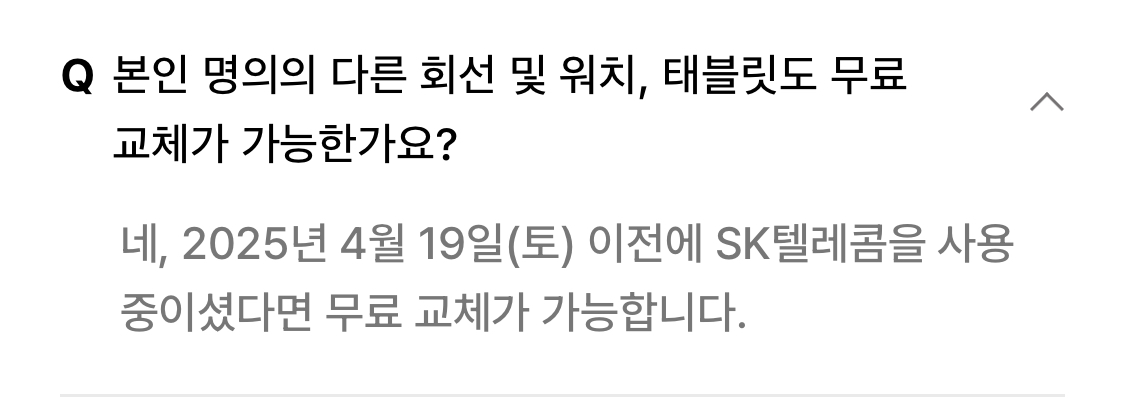 - SKT ๊ฐ์ ์ ์ค 4์ 19์ผ(ํ ) ์ดํ ์ ์ฌ์ ๊ต์ฒดํ ๊ฐ์ ์๋ ๊ต์ฒด ์ ์ฒญ ๋์์ ํฌํจ๋์ง ์์ต๋๋ค.